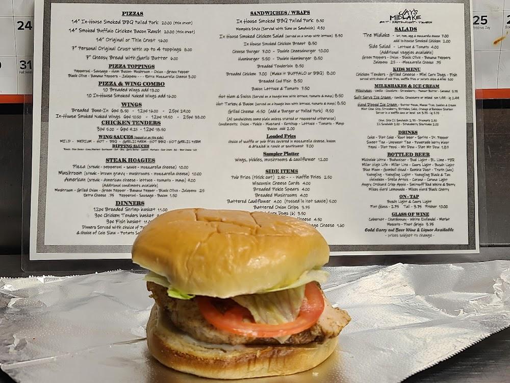 Jay's Midlake serves an extensive menu, focusing on hearty, comfort food. The Pulled Pork Sandwich is immensely popular, complemented by a variety of sides like waffle fries and Wisconsin cheese curds.